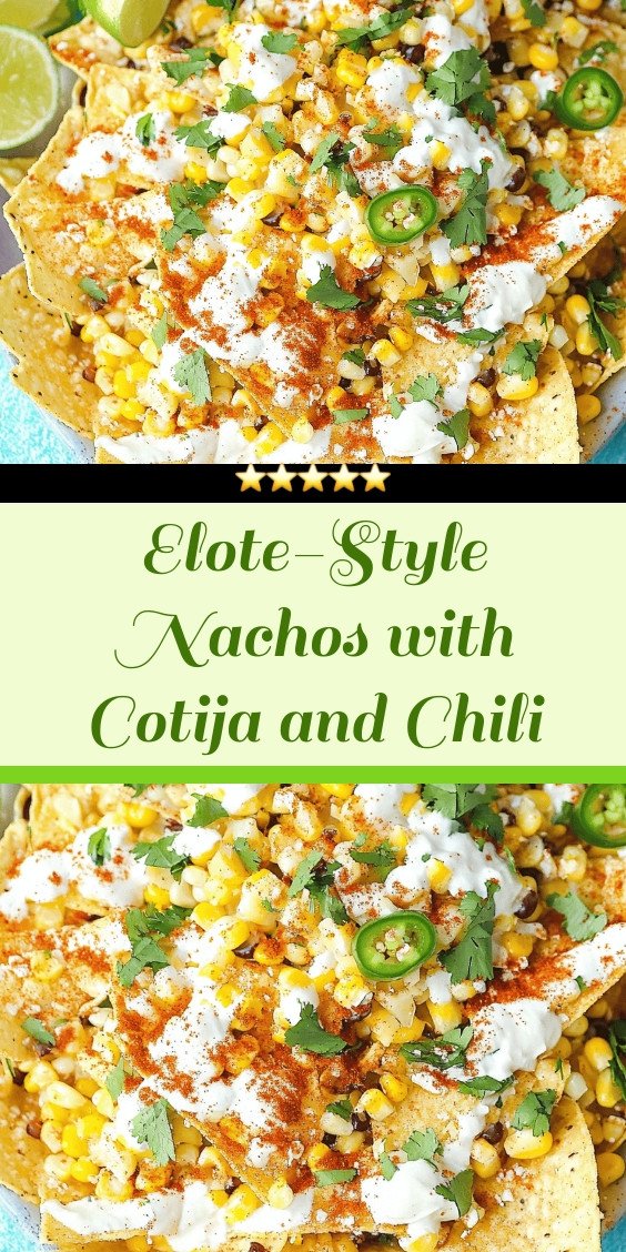 The ultimate party snack! Our Elote-Style Nachos are loaded with grilled corn, creamy sauce, crumbled Cotija cheese, and a sprinkle of chili powder. Irresistible! elote nachos, mexican street corn recipe, easy party appetizers, cotija cheese recipes, spicy snack ideas